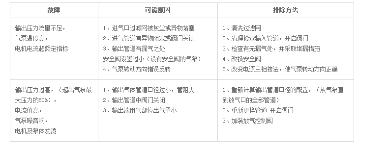气泵应放置在较平稳的地方,周围环境应清洁、干燥、通风。气泵叶轮旋转方向必须与风扇罩壳上所标箭头方向一致。气泵工作时,工作压力不得大于技术参数表,以免使气泵产生过大的热量和电动机超电流引起气泵损坏。第一类气泵平时不需要加润滑脂。第二类气泵(4KW以上)端的轴承是安装在泵盖中间,此类气泵端的轴承应定期加润滑脂(7018高速润滑脂)。每月一次,对于三班 连续工作的气泵应当增加加油次数。出气两端的过滤网应根据情况适时清洗,以免堵塞影响使用。进出气口外联接必须采用软管联接(如橡胶管、塑料弹簧管)。轴承的更换:更换轴承必须由熟悉修理工作的人进行操作。拆卸时,不能硬撬叶轮,应用专用拉马拉出,同时不要遗漏调节垫片,以免影响出厂时已调节好的间隙。如有困难应送本公司修理。严禁固体、液体及有腐蚀气体进入泵体。
